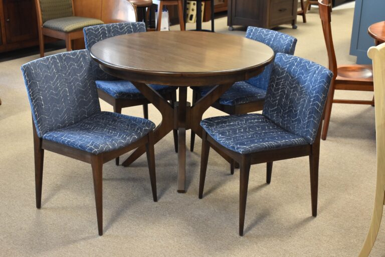 This 42″ round dining set is handcrafted in America with all-natural solid Brown Maple and is built to last. It features a pedestal base, four side chairs, and a 12″ leaf. It can be customized the exact way you want by choosing your style, size, wood, color, base, chairs, and more, in order to make it fit your needs and your home perfectly! It is shown in the photo above with Trogan upholstered side chairs. It is shown in Hickory in the photo below.